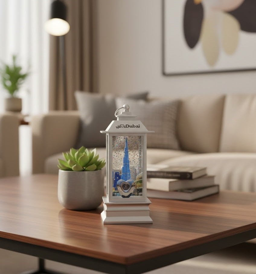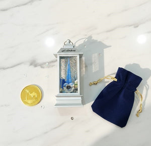 Elegant Dubai themed lantern featuring the iconic Burj Khalifa inside a glitter display